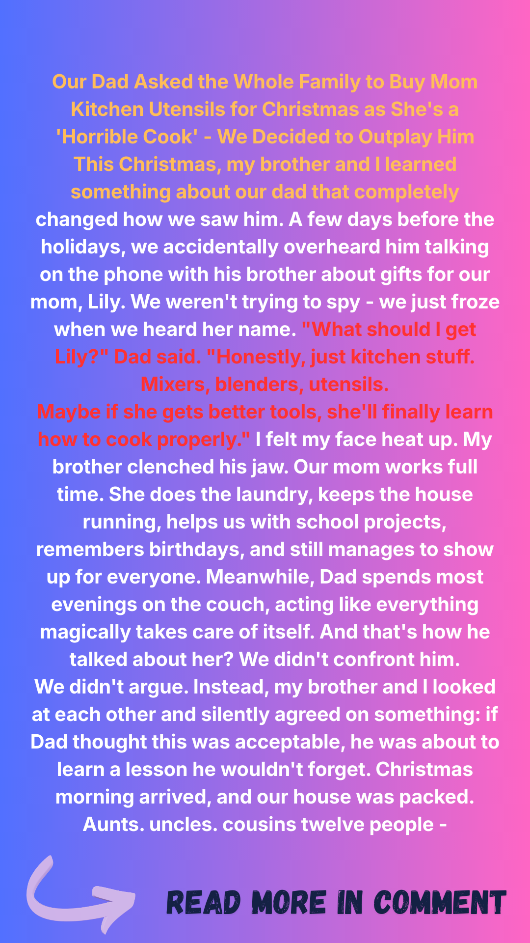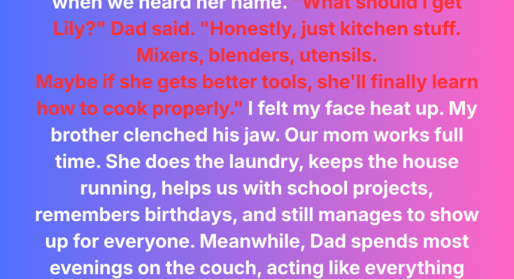 When my brother and I overheard Dad calling Mom “lazy” and mocking her cooking, we knew we couldn’t let it slide. What started as a Christmas gift list turned into a clever plot to teach him a lesson he’d never forget.