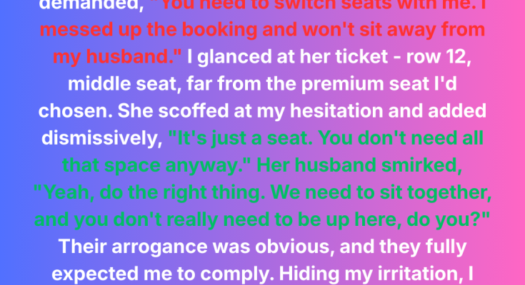 They stopped right next to me, and the woman’s eyes zeroed in on my seat. Without so much as a polite greeting and while exuding entitlement, she rudely demanded, “You need to switch seats with me. I accidentally booked the wrong seat, and I refuse to sit away from my husband.”