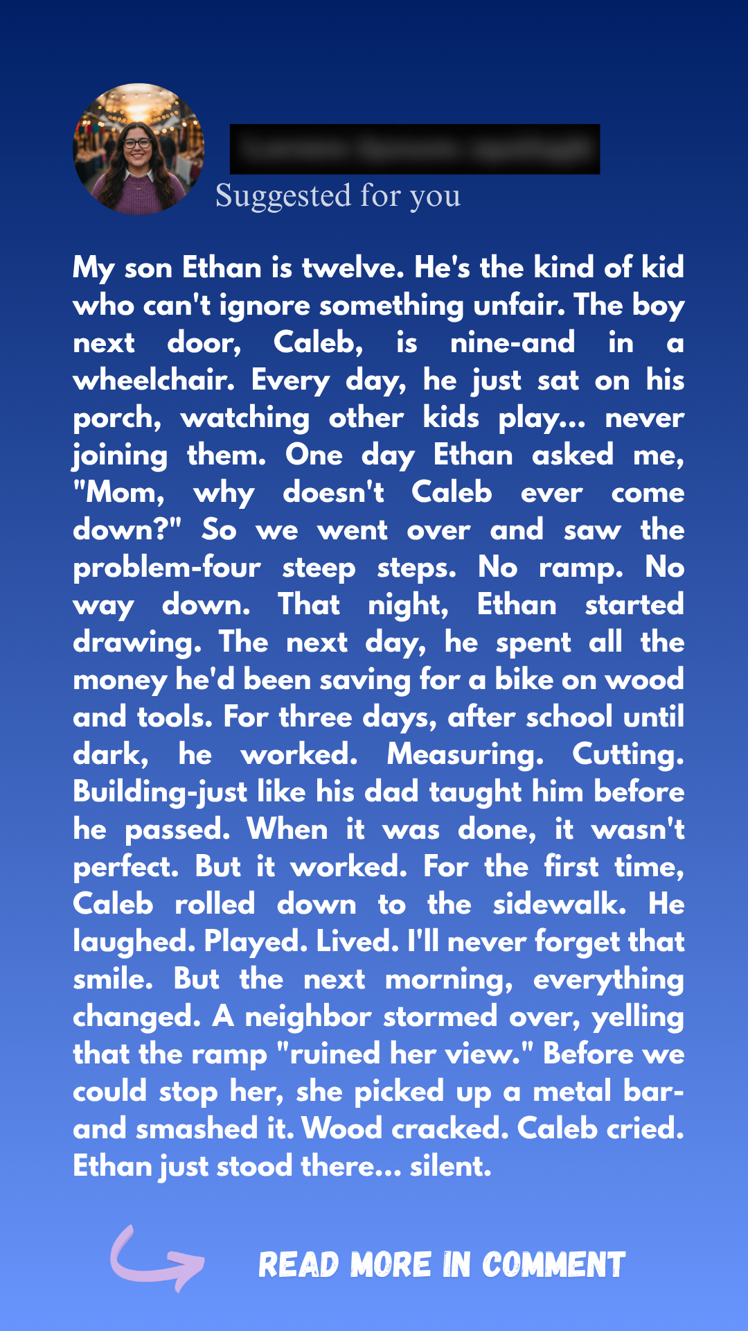 Our neighbor’s son, Caleb, is nine. He is quiet, observant, and always sitting on the front porch in his wheelchair. He watches the street as if it were a play he cannot join.