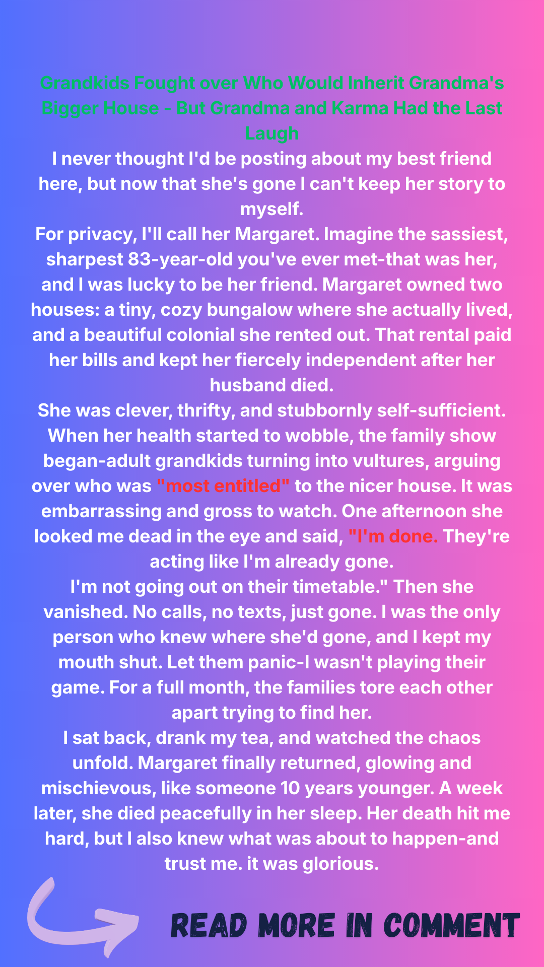 I stood on my porch, clutching the card, tears stinging my eyes. Margaret wasn’t just gone. She was free. And as much as I missed her, I couldn’t help but feel a little envious.