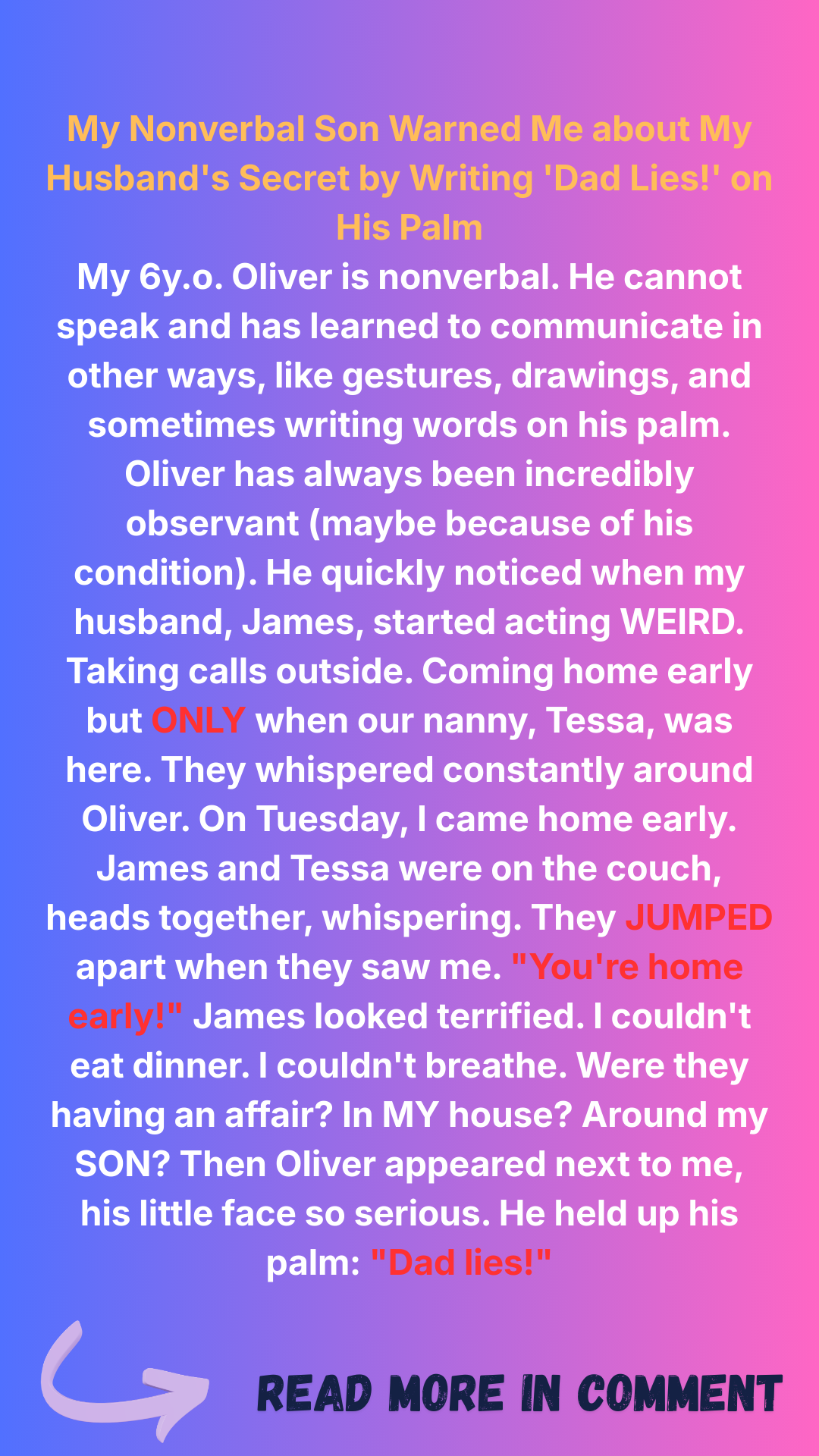 My husband’s early returns from work — always when our nanny was still there — set off alarm bells. But it was our nonverbal six-year-old, Oliver, who saw the truth. His warning, “Dad lies!” written on his palm in marker, led me to uncover a secret that would shatter our world.