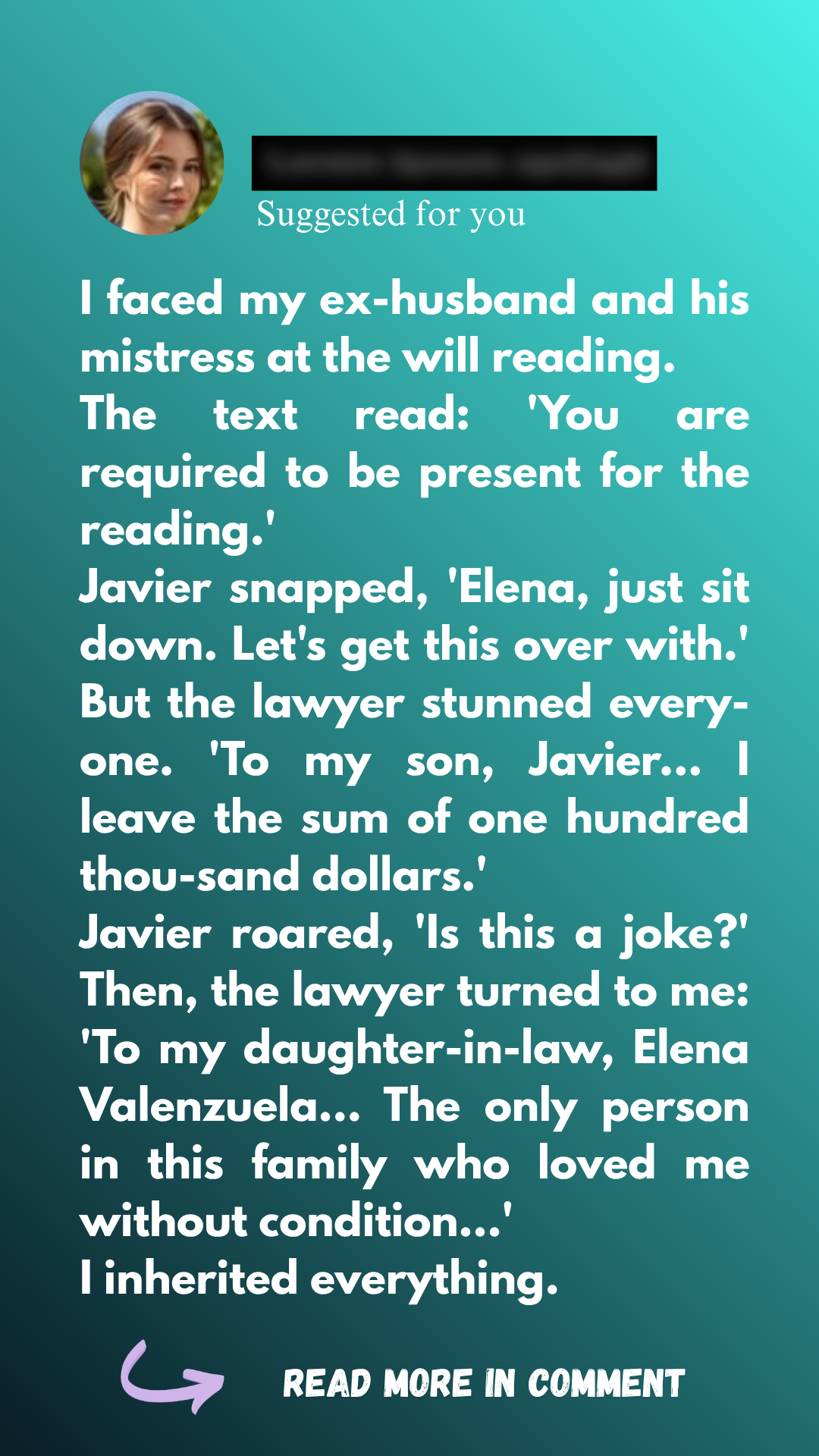 Slowly, I turned. Javier wore a flawless navy suit, the picture of composed grief masking ambition. Camila sat beside him, her brightly dyed hair and smug expression radiating misplaced triumph, as though she had won something of value. Meredith sat upright, her eyes sharp and predatory, unaware that the balance of power in the room was about to shift irrevocably.