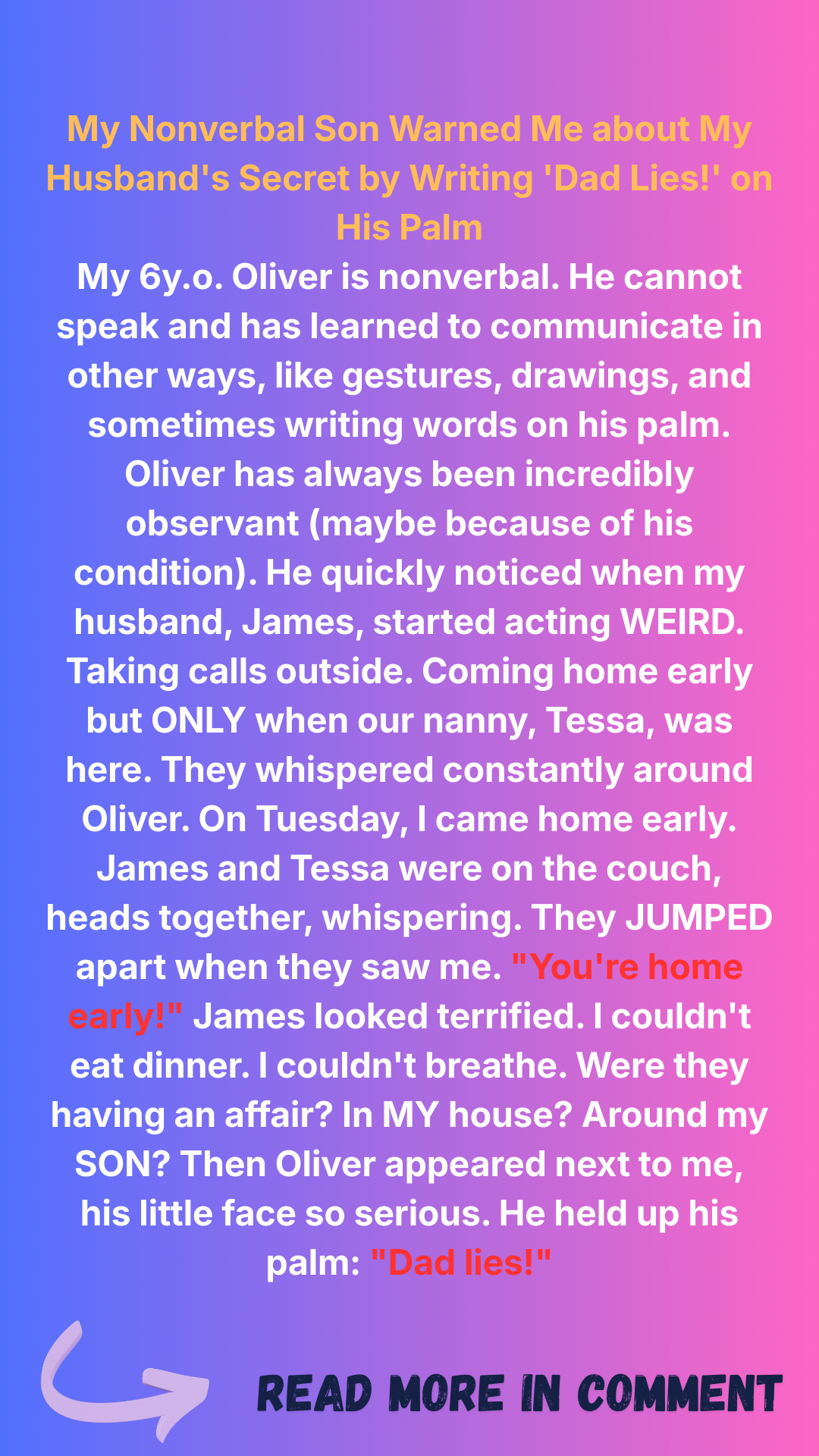 My husband’s early returns from work — always when our nanny was still there — set off alarm bells. But it was our nonverbal six-year-old, Oliver, who saw the truth. His warning, “Dad lies!” written on his palm in marker, led me to uncover a secret that would shatter our world.