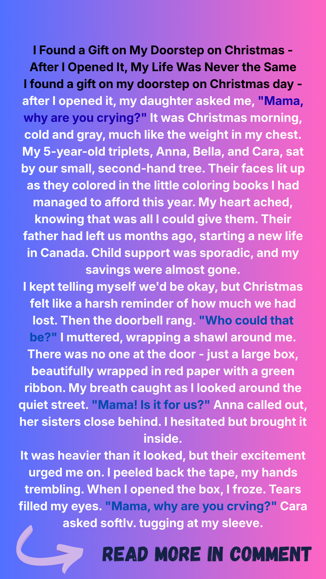 On Christmas morning, Samantha sits quietly, questioning everything—her choices, their future, and whether her children are truly happy. The day feels heavy, the joy of the season missing. Then, a knock at the door breaks the silence. A mysterious package sits on the doorstep, its contents so unexpected and thoughtful that it brings her to tears…