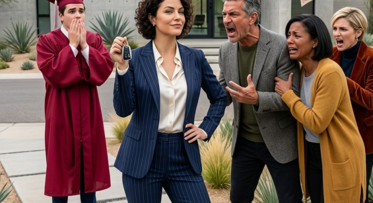 Not my younger brother, Noah, standing there in his navy graduation gown with the keys still in his hand. Not my mother, frozen beside the cake table holding a paper plate and plastic fork. Not my golden-child sister, Lauren, who had been smiling moments earlier and now looked like someone had just torn apart a script she believed everyone else was following.