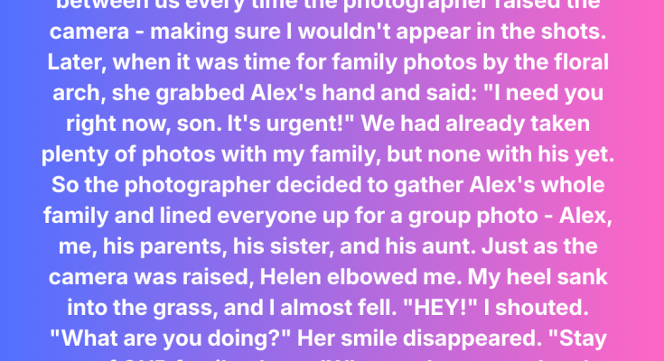 It started small. During a group photo near the dance floor, Helen, Alex’s mom, kept nudging her way in front of me. At first, I thought it was just a coincidence. She smiled widely, all teeth and tension. I laughed it off and stepped aside without saying anything.
