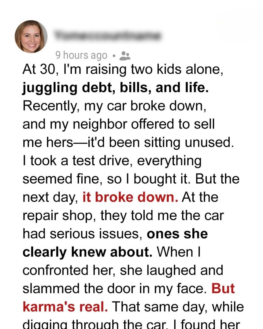 You know that moment when life kicks you while you’re already down? My scheming neighbor thought she could pull a fast one on a broke single mom like me. She tricked me into buying her busted car and figured she’d pocket my hard-earned money.