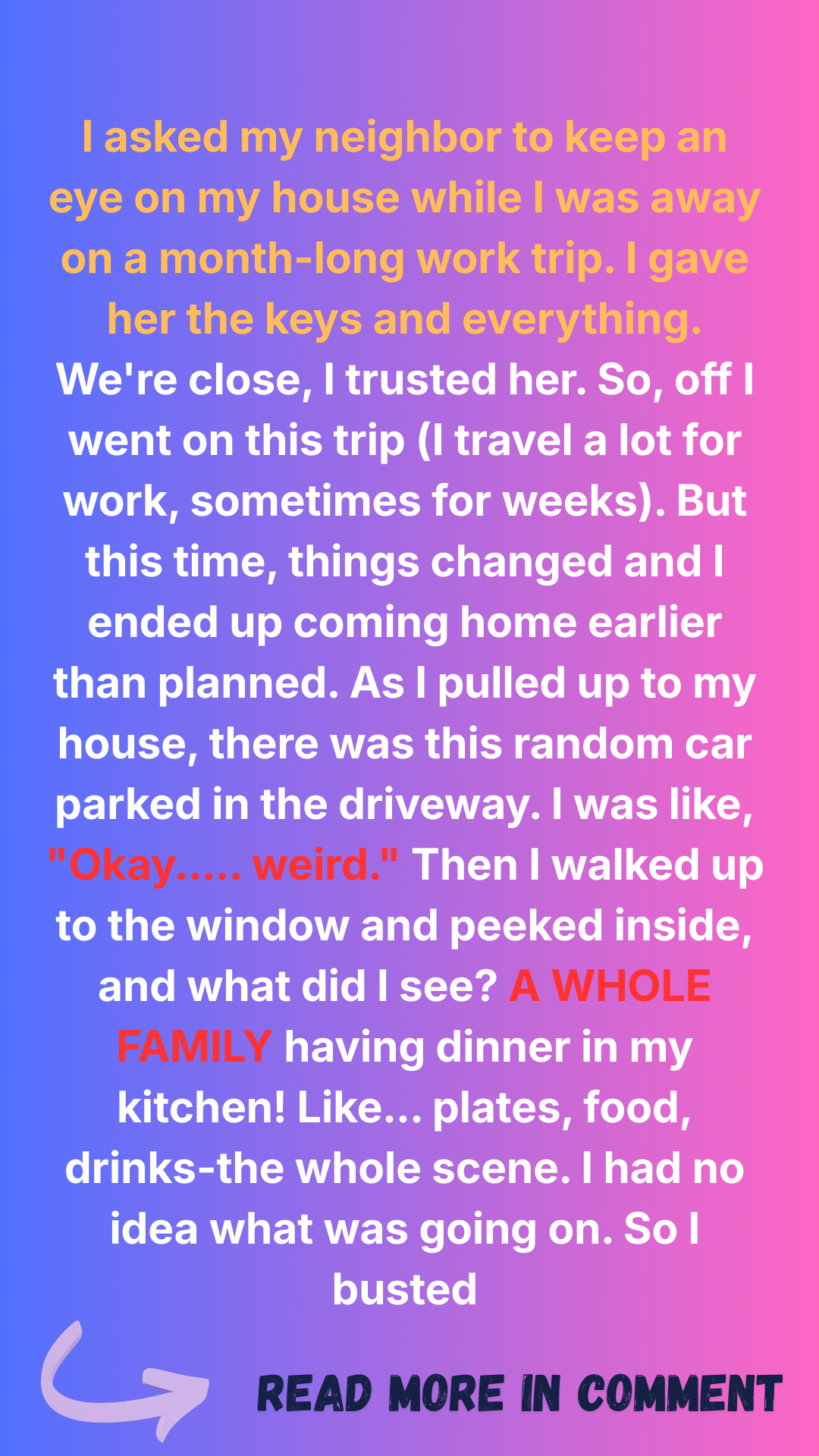 I left for a month-long work trip, trusting my neighbor and friend to watch my house. But when I returned early, I found a strange car in the driveway… and a family of strangers eating dinner in my kitchen!