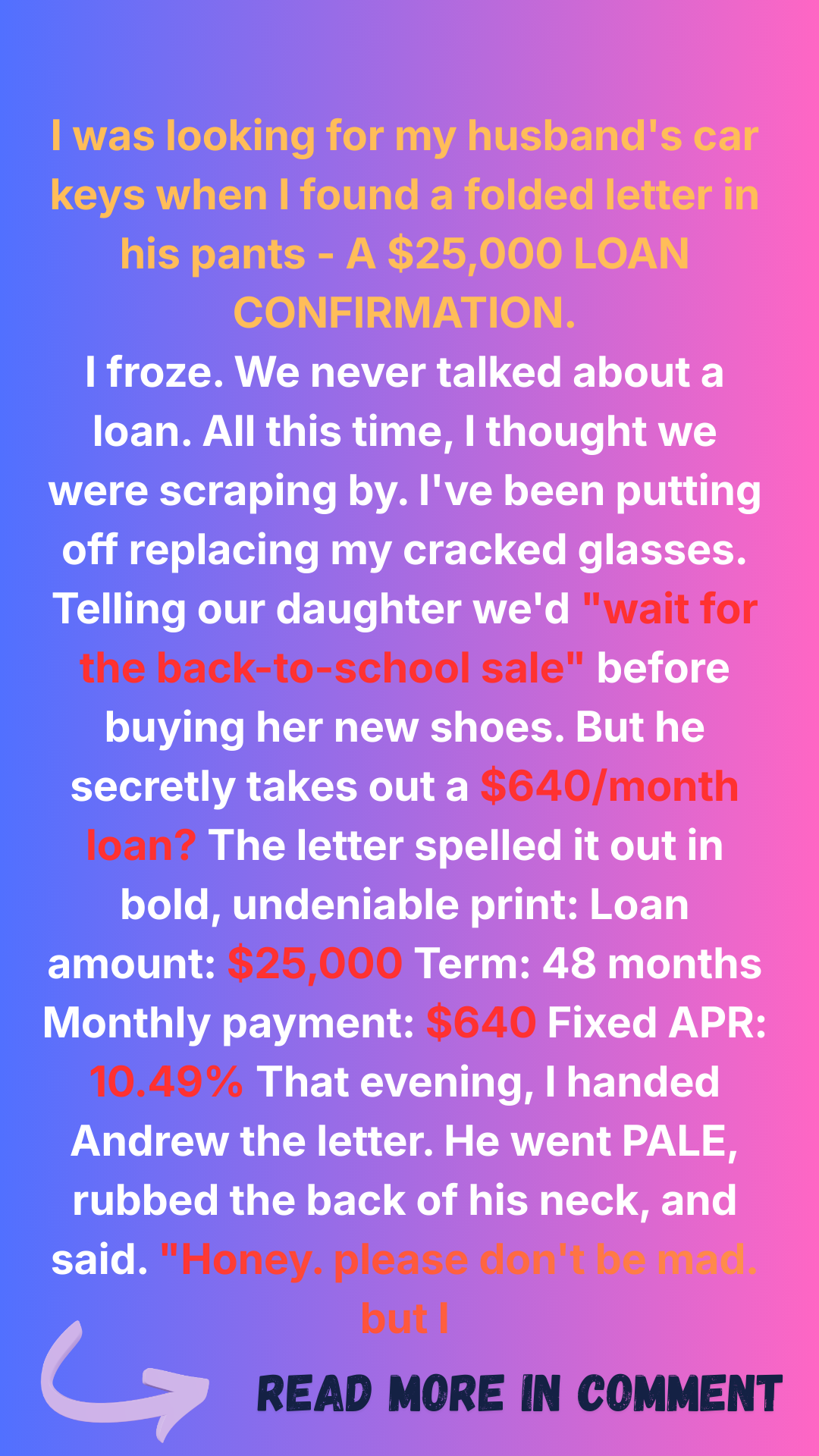 I was hunting for Andrew’s car keys when I found a folded letter in his work pants. It was a $25,000 loan confirmation. I stared at it in shock because he never mentioned any loan, and we were barely scraping by each month. What I discovered next turned my world upside down.