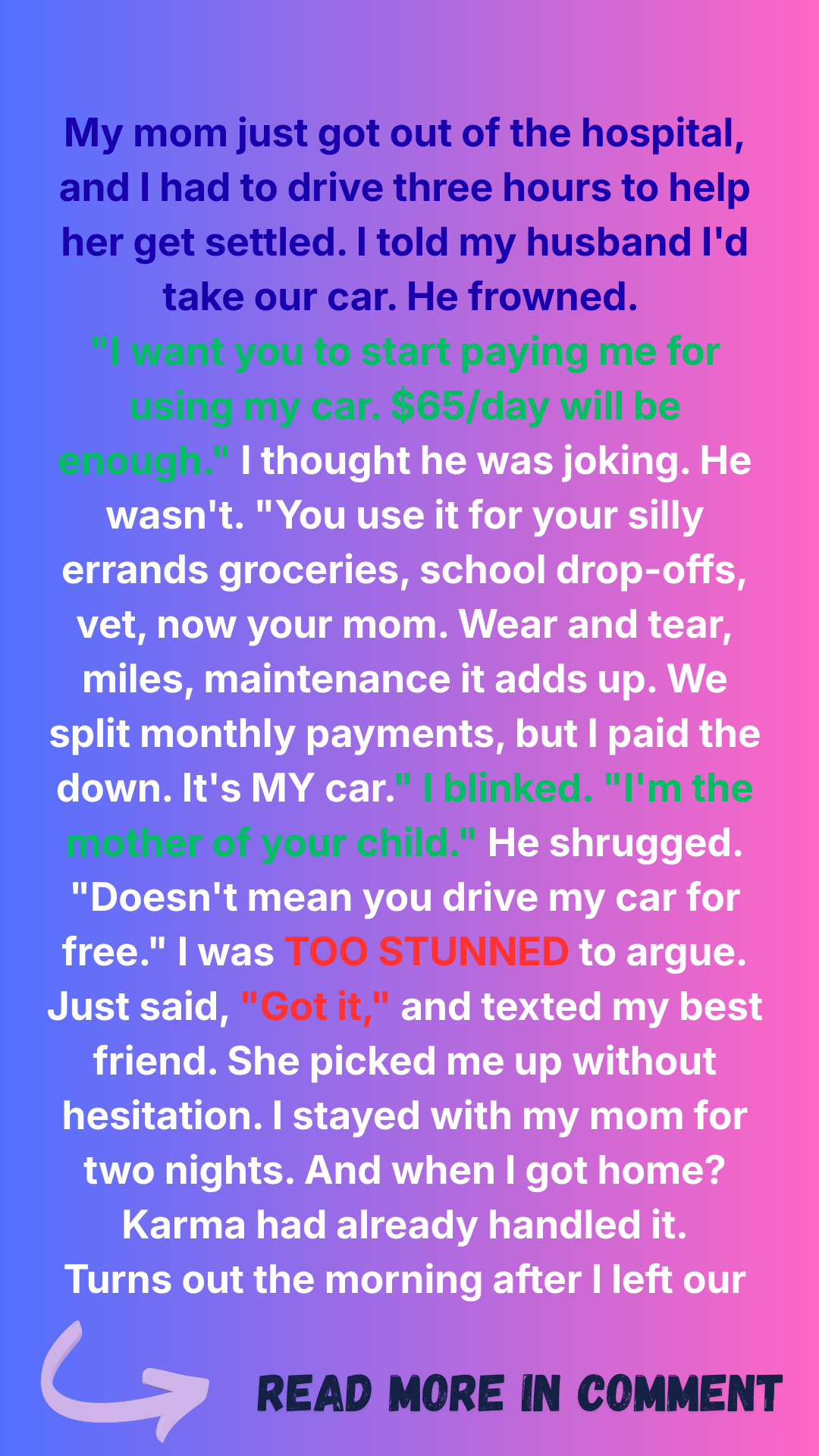 I was heading out to visit my mom after her stroke and asked to borrow my husband’s car. His response shook me: “Sure—$65 a day!” I was shattered when I realized he didn’t see me as his wife… just a roommate with a bill. But while I was gone, karma delivered a lesson he won’t forget.