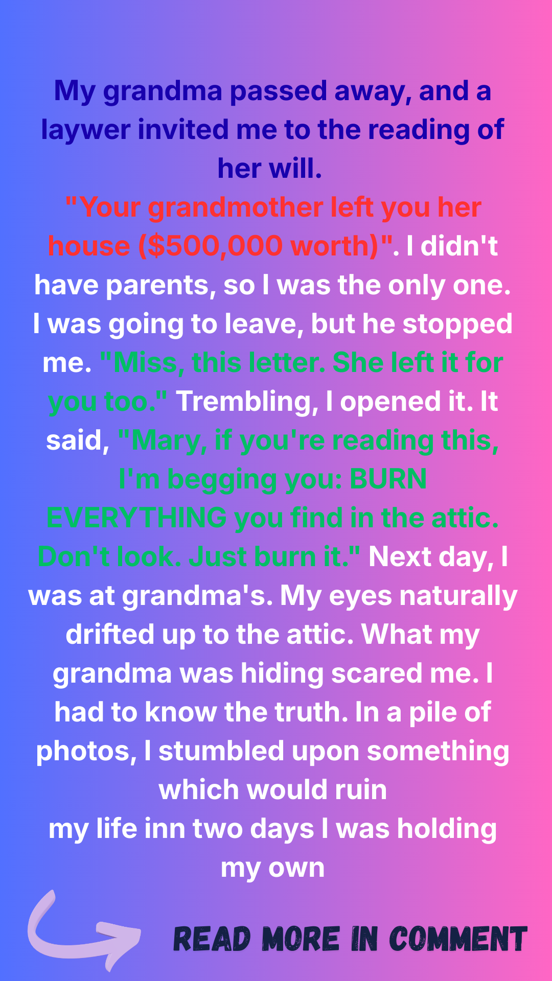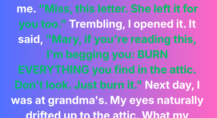 It spoke of love, of memories, of a life well-lived. But then, at the very end, there it was. A line that chilled me to the bone, a sudden, stark departure from her usual gentle nature. “And my dearest, one last thing: Never, under any circumstances, go into the attic. It holds things best left undisturbed. My dying wish, my greatest fear.”