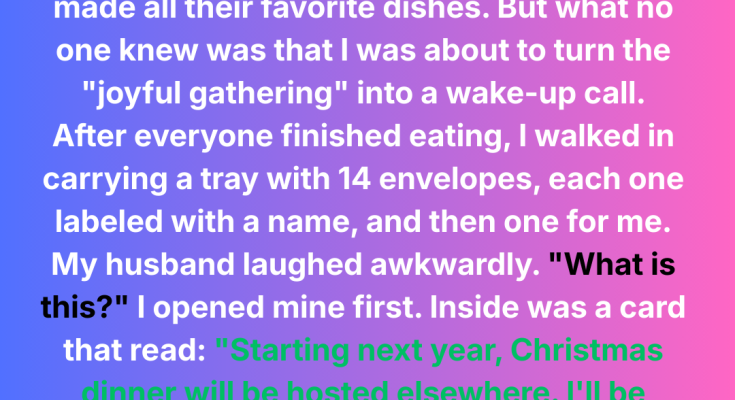 After everyone finished eating, I walked into the dining room carrying a tray. On it were fourteen envelopes, each one labeled with a name, and then a final one for me. My husband laughed awkwardly, looking around the table. “What is this?” he asked.