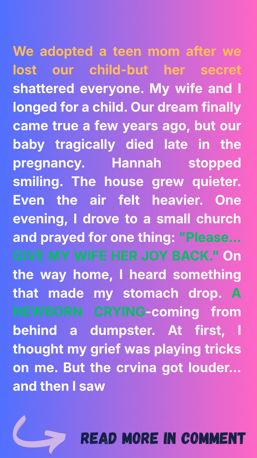 But when I heard that baby, I couldn’t resist. Not after what we’d lost. Not after watching my wife die a little every day.