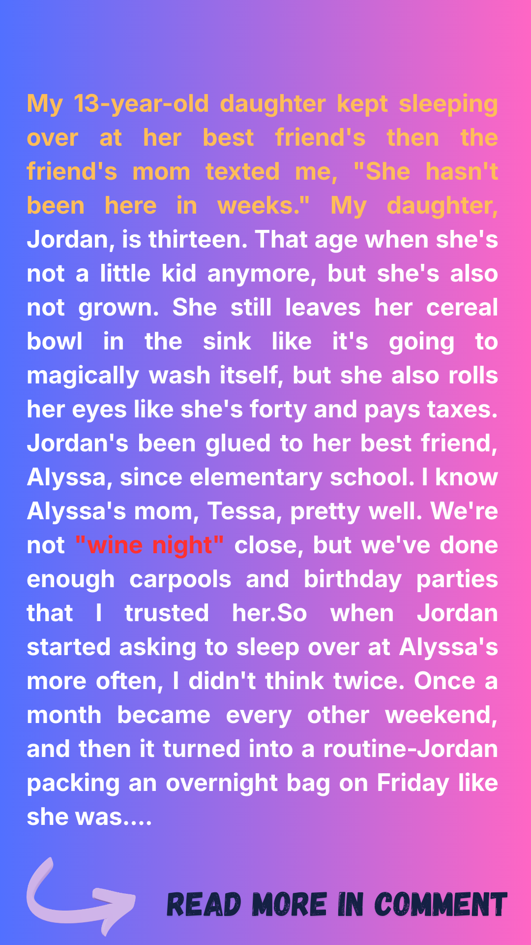 I’m a 40-year-old mom, and I thought my 13-year-old was just having innocent sleepovers at her best friend’s house—until her friend’s mom texted me, “Jordan hasn’t been here in weeks,” and my stomach dropped.