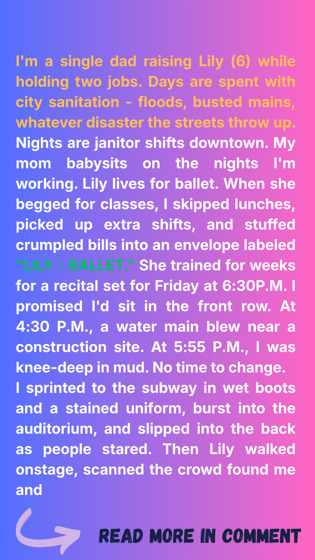 “My daughter. She danced before she could talk. I spent years missing recitals for meetings.”