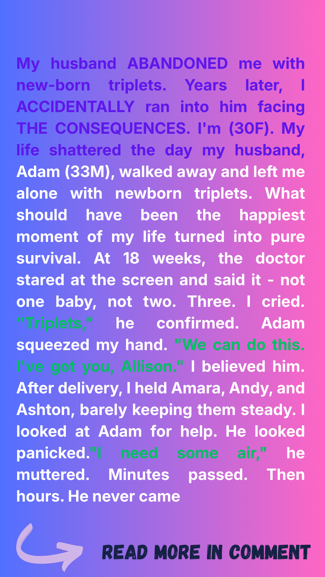 I was 23 when Adam walked out of our lives, and even now, at 35, I can still hear the silence he left behind. There was no final conversation. No apology. Just the sound of the hospital door closing behind him while I took turns holding our newborn triplets in my arms. I was stunned, stitched, and entirely alone.