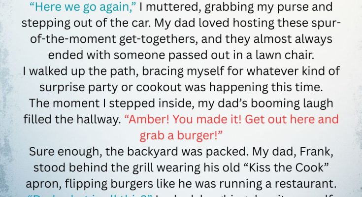 My dad, Frank, stood behind the grill wearing his old “Kiss the Cook” apron, flipping burgers like he was running a restaurant. “Dad, what is all this?” I asked, laughing despite myself. “Just a BBQ for the guys from the shop,” he said, brushing sweat from his forehead.