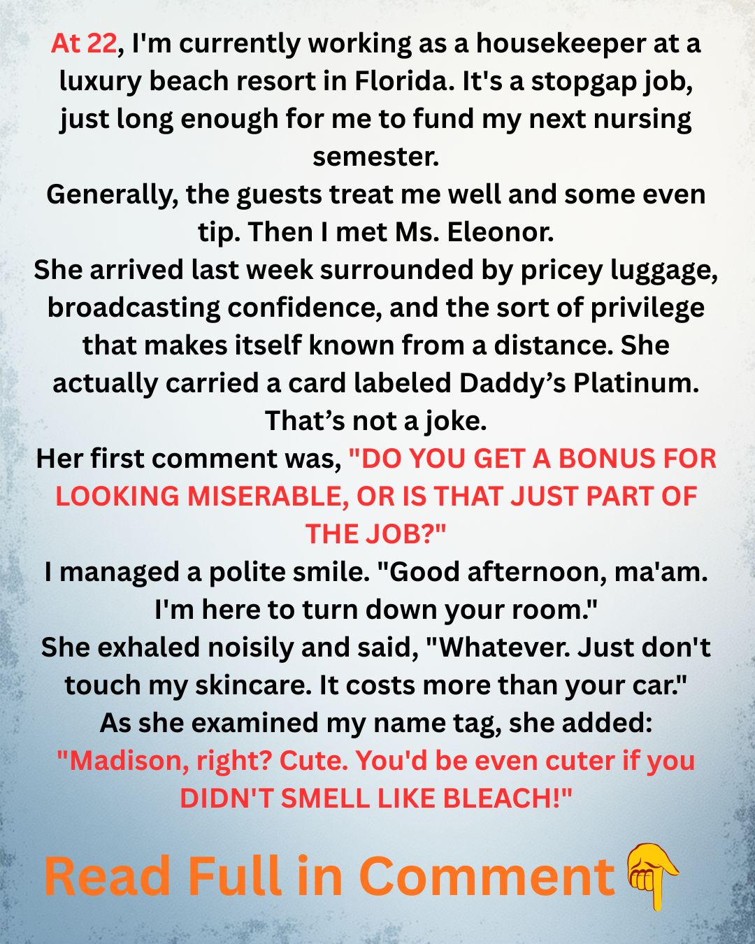 “I’ll speak with the resort manager tonight. Madison, you’ll start your paid leave tomorrow morning. Eleonor, you’ll report to housekeeping at 6 a.m.