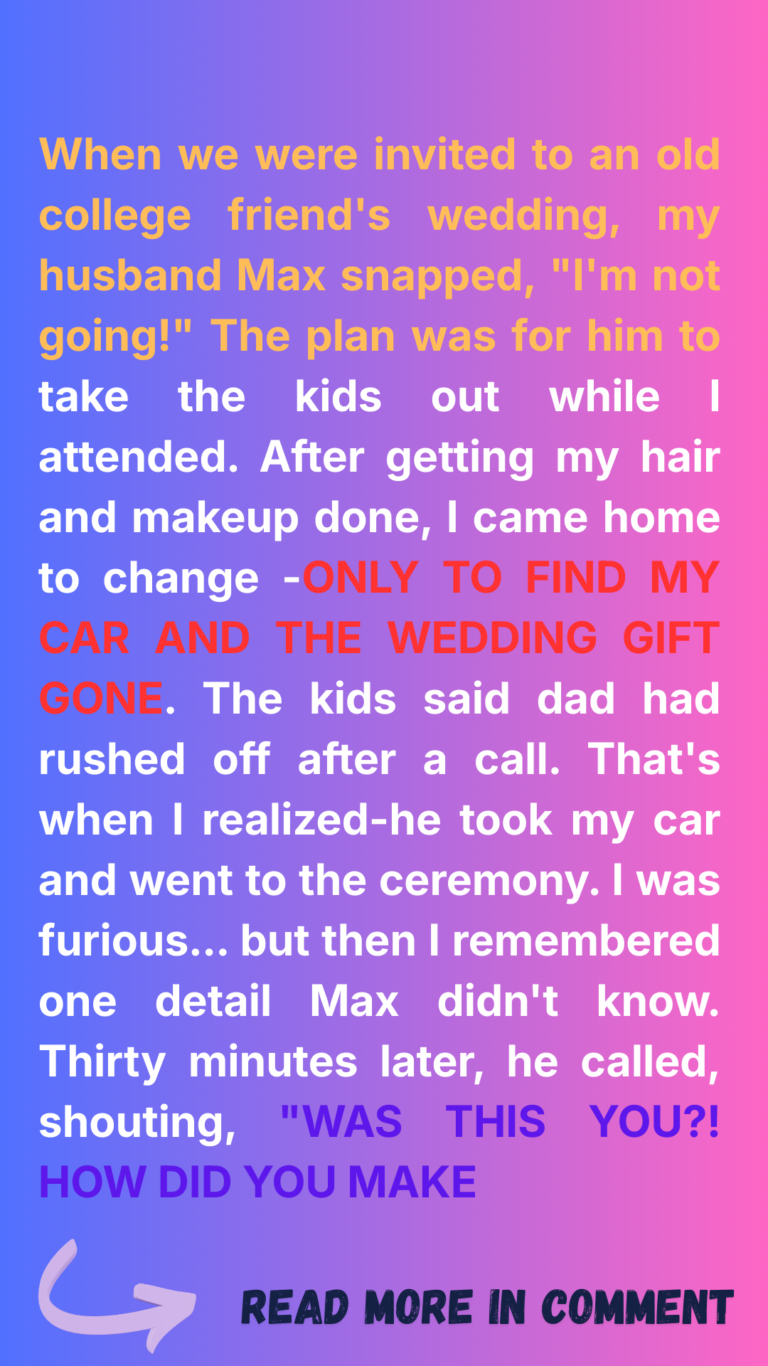 When Kate’s husband took her car, left their kids behind, and rushed to a wedding he swore he wouldn’t attend, she felt betrayed. What he didn’t know? Kate had the power to stop him — and she didn’t hesitate to use it.