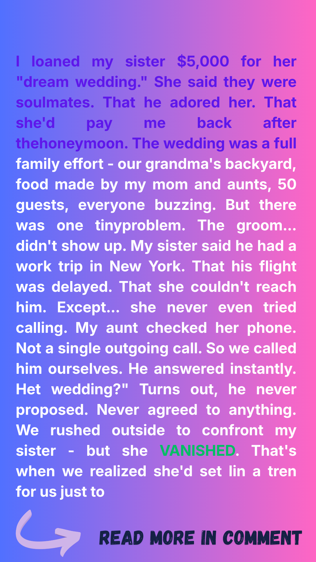 She’d invented the perfect groom, created an elaborate wedding story, and used our family’s willingness to help against us. She knew I’d give her the money because I always did.