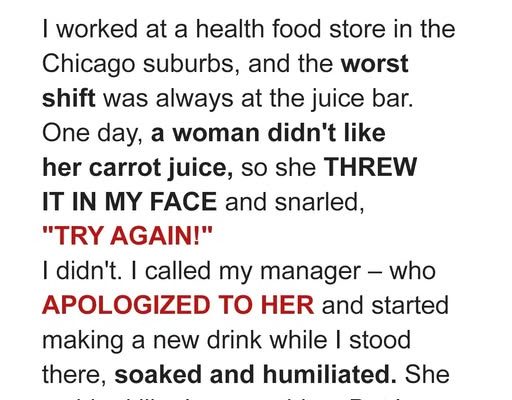 She smirked like I was nothing. But I wasn’t anyone’s punching bag, so I got my revenge right there. As the manager was making the juice, I calmly reached for the little chalkboard on the counter