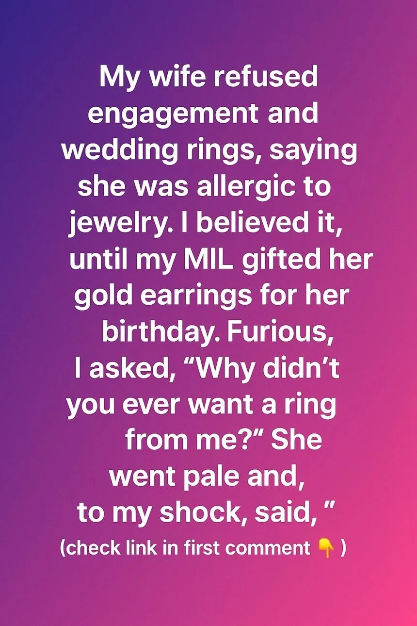 Eventually, I gathered the courage to ask her. That evening, I gently said, “Why didn’t you ever want a ring from me?” Her face softened, and a quiet pause filled the room. She admitted it wasn’t an allergy at all, but something more personal.
