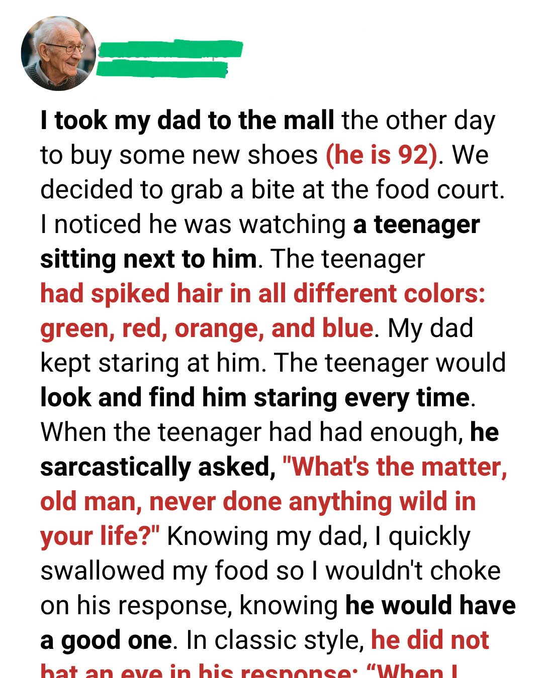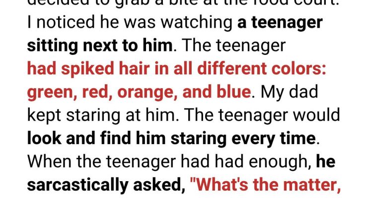 Dad calmly set his fork down, offered a gentle smile, and then replied — and his words were so unexpected that even the boy leaned in a little. “When I was young,” Dad said, “I didn’t have colorful hair, but I tried to make the world around me brighter through kindness, respect, and joy.”