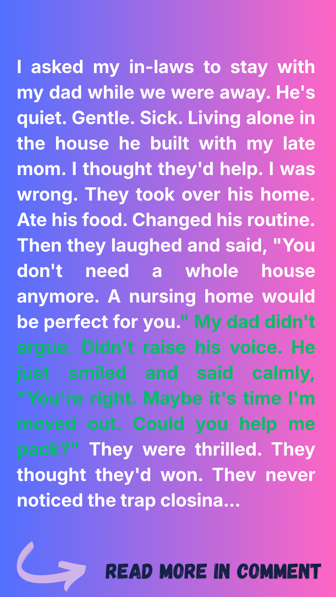It wasn’t an easy decision. My dad isn’t helpless, but he’s not strong either. He’s quiet. Gentle. Sick. He moves slowly and hates asking for help. He still lives in the house he built with my late mother—every corner filled with routines and memories that keep him steady.