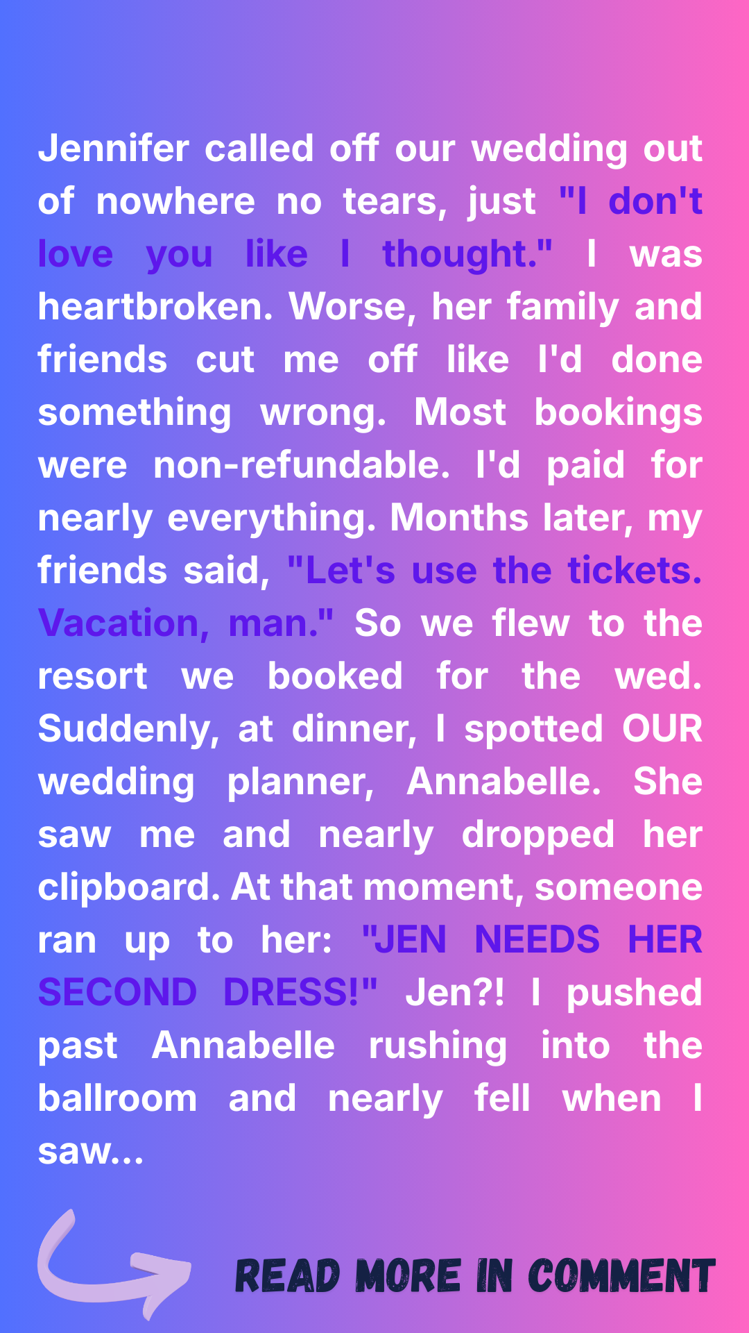 Then I heard the name that punched the air from my lungs: Jennifer. There she was — in a white wedding dress — standing at the altar, on the arm of another man. The same flowers, the same cake, the same playlists we picked — but my name wasn’t on the seating chart anymore.