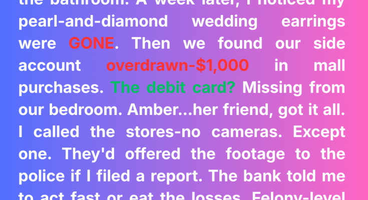 I started calling stores. Most had no cameras. One boutique did — but they’d only release footage if we filed a police report. The bank told us the same: no theft report, no reversal of fees. Between the stolen cash, overdraft fees, and the earrings, we were out more than $2,000 — enough for felony theft in our state.