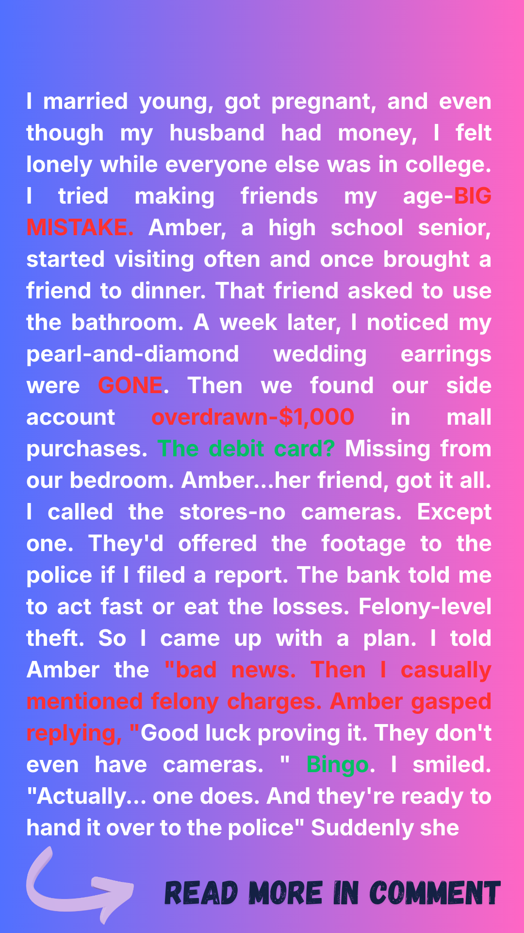 I wasn’t sure I wanted to go full legal on a couple of teenagers… but I wanted answers. So I texted Amber: “We need to talk.” When she showed up with her bright smile, I hit her with the news: the jewelry was gone, the card was used, and I was filing felony theft charges.