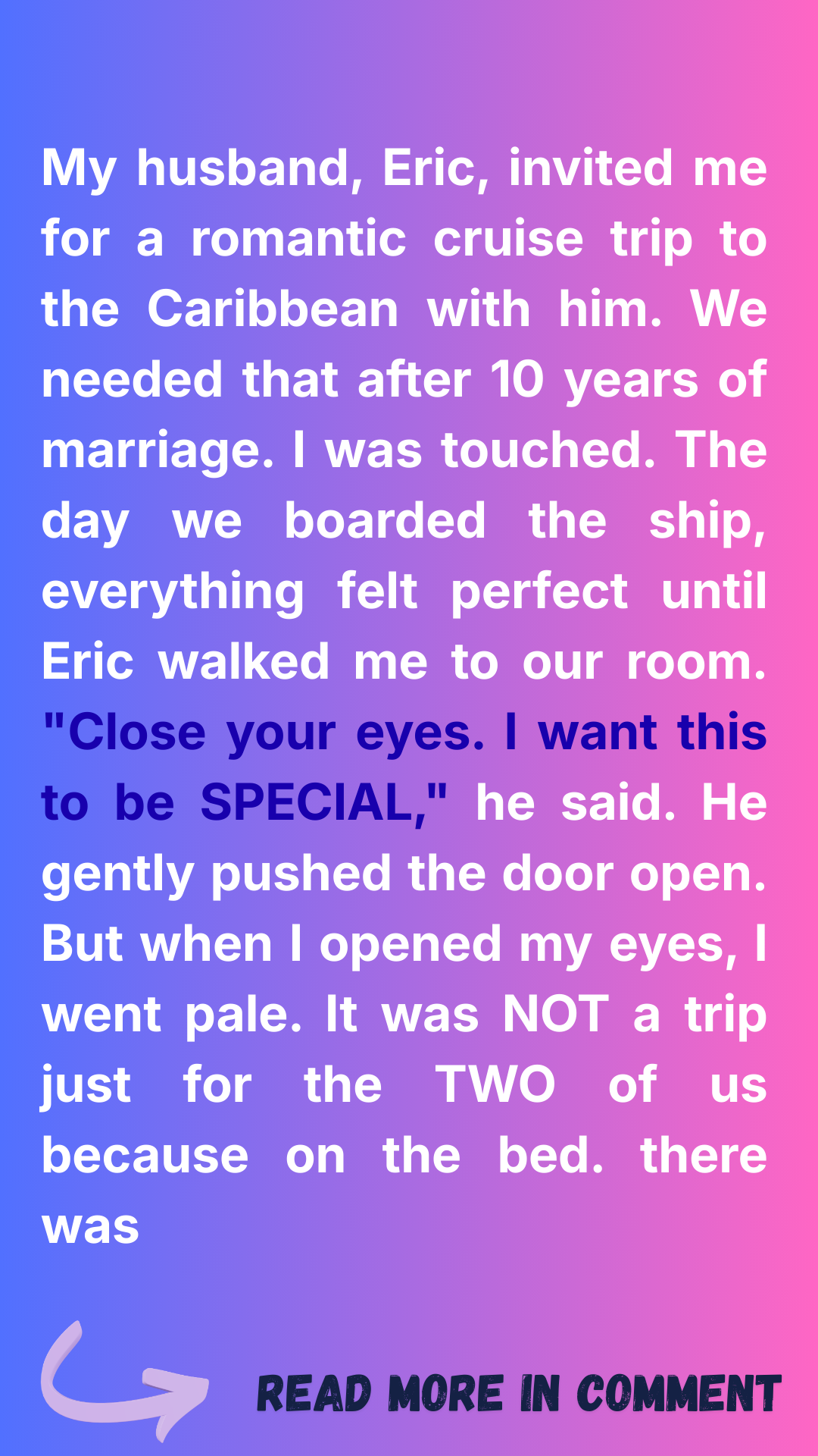 Eric had been distant lately. Long work hours, hushed phone calls in the garage, a scent on his shirt that wasn’t mine. Still, this cruise, this surprise felt like a peace offering. Or maybe a distraction.