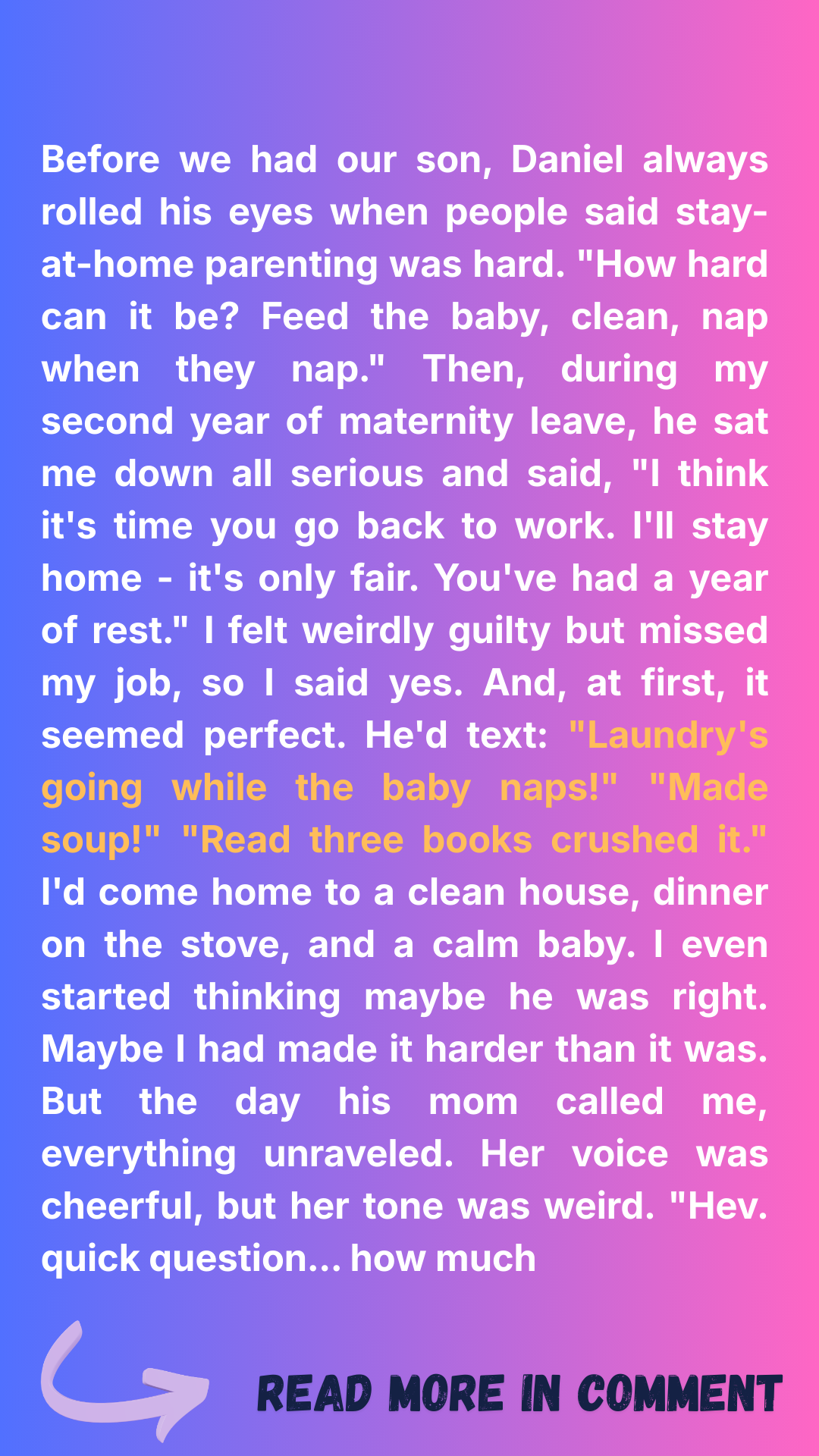 When my husband Daniel offered to stay home with our baby, Cody, so I could return to work, I thought I’d hit the jackpot. A clean house, a calm baby, homemade meals — from the outside, it looked perfect. But one phone call from his mom changed everything.