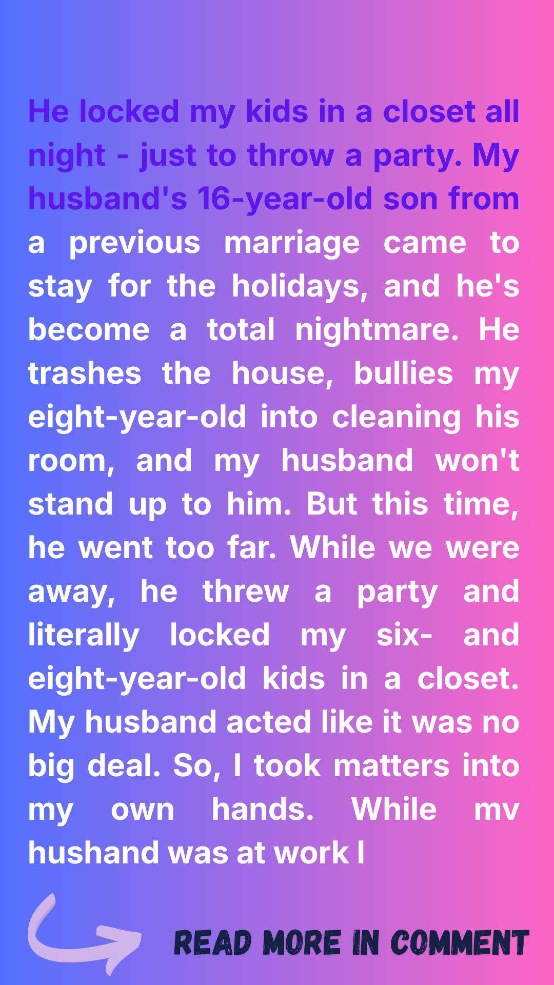 That weekend, we left town and put Jake in charge of watching the kids. We came home to trash everywhere, beer bottles, a trashed house… and Emma and Noah locked in a closet all night. Emma’s tear-streaked face haunted me. Jake said it was because they “annoyed his friends.” Mark just told him to apologize.