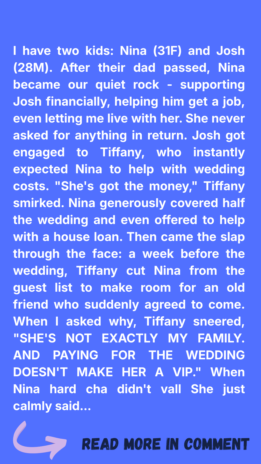 I’m a mom to two kids: Nina, now 31, and Josh, 28. After their father passed nearly a decade ago, Nina became our rock — steady, generous, and always the one to keep this family afloat when everything felt like it was falling apart.