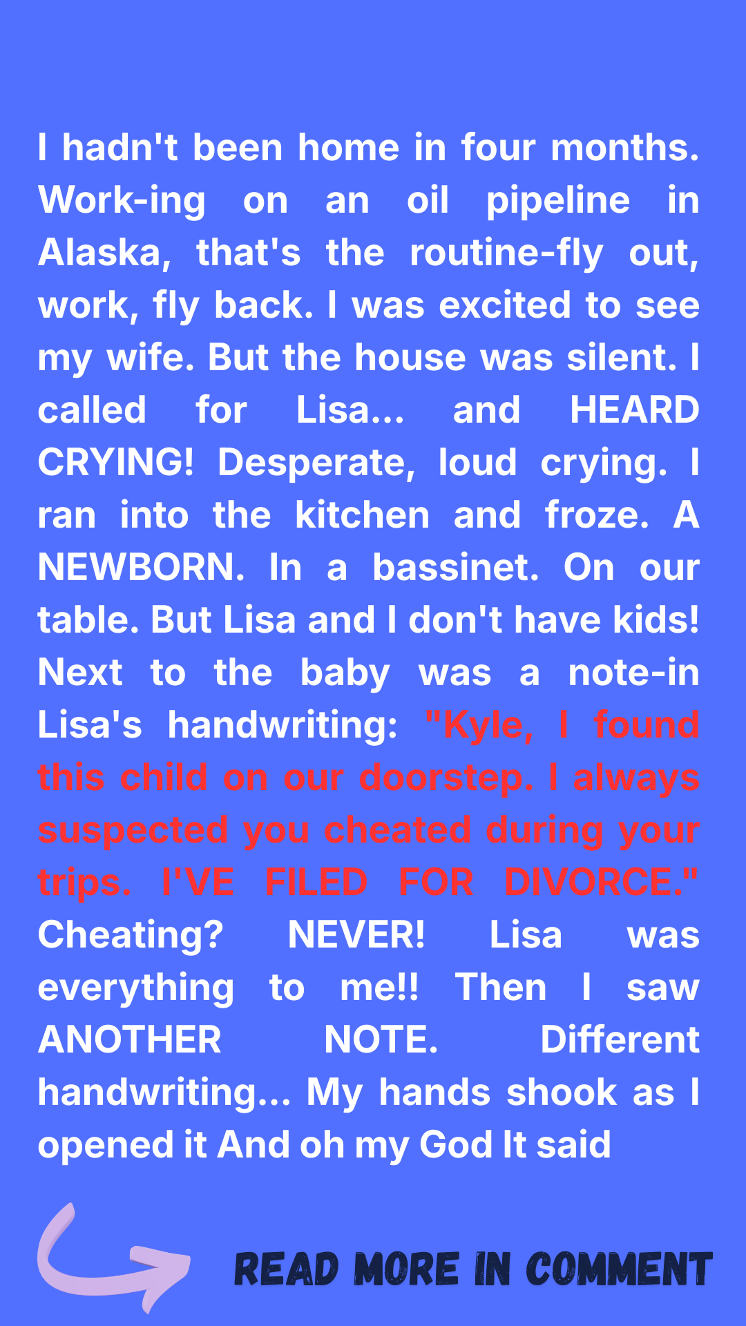 Kyle sat down and dropped his head in his hands. He couldn’t believe this was happening to him. This child wasn’t his, he’d never cheated on Lisa, ever! A soft cooing sound made him raise his head.