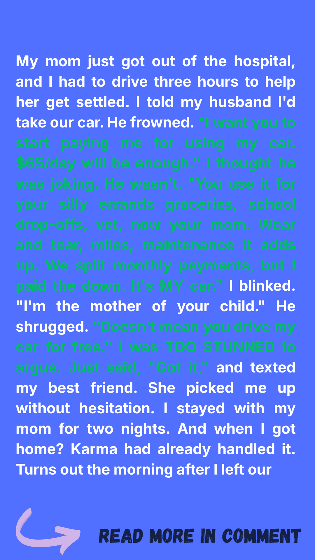 I was heading out to visit my mom after her stroke and asked to borrow my husband’s car. His response shook me: “Sure—$65 a day!” I was shattered when I realized he didn’t see me as his wife… just a roommate with a bill. But while I was gone, karma delivered a lesson he won’t forget.