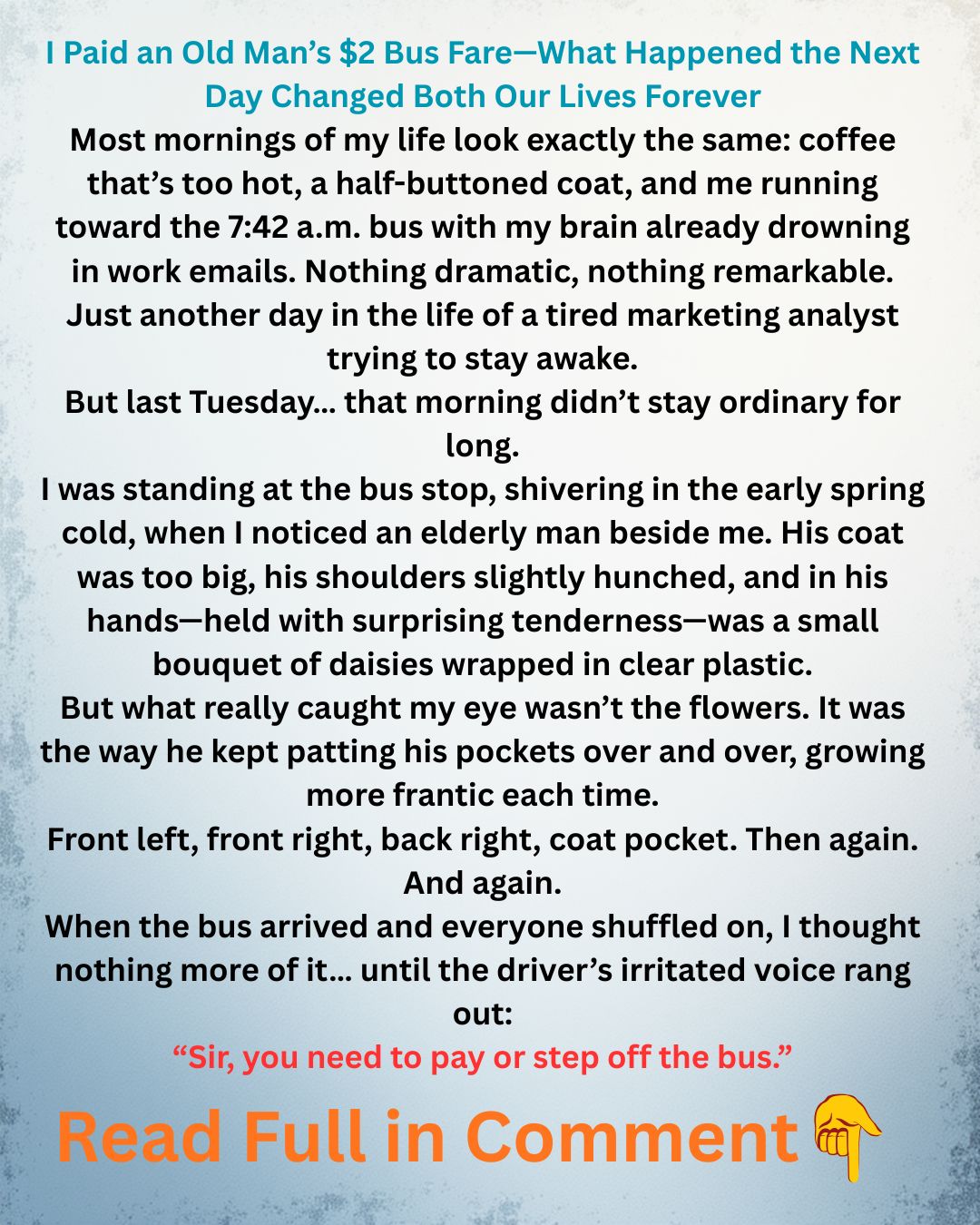 An elderly man stood near the curb, slightly hunched, clutching a small bouquet of daisies wrapped in plastic. His coat hung loosely on his thin frame, the faded fabric suggesting it had once been navy but had long surrendered to a tired blue-gray. But what struck me most were his hands — anxious hands patting every pocket in a repeated loop: front left, front right, back right, coat pocket… then starting over.
