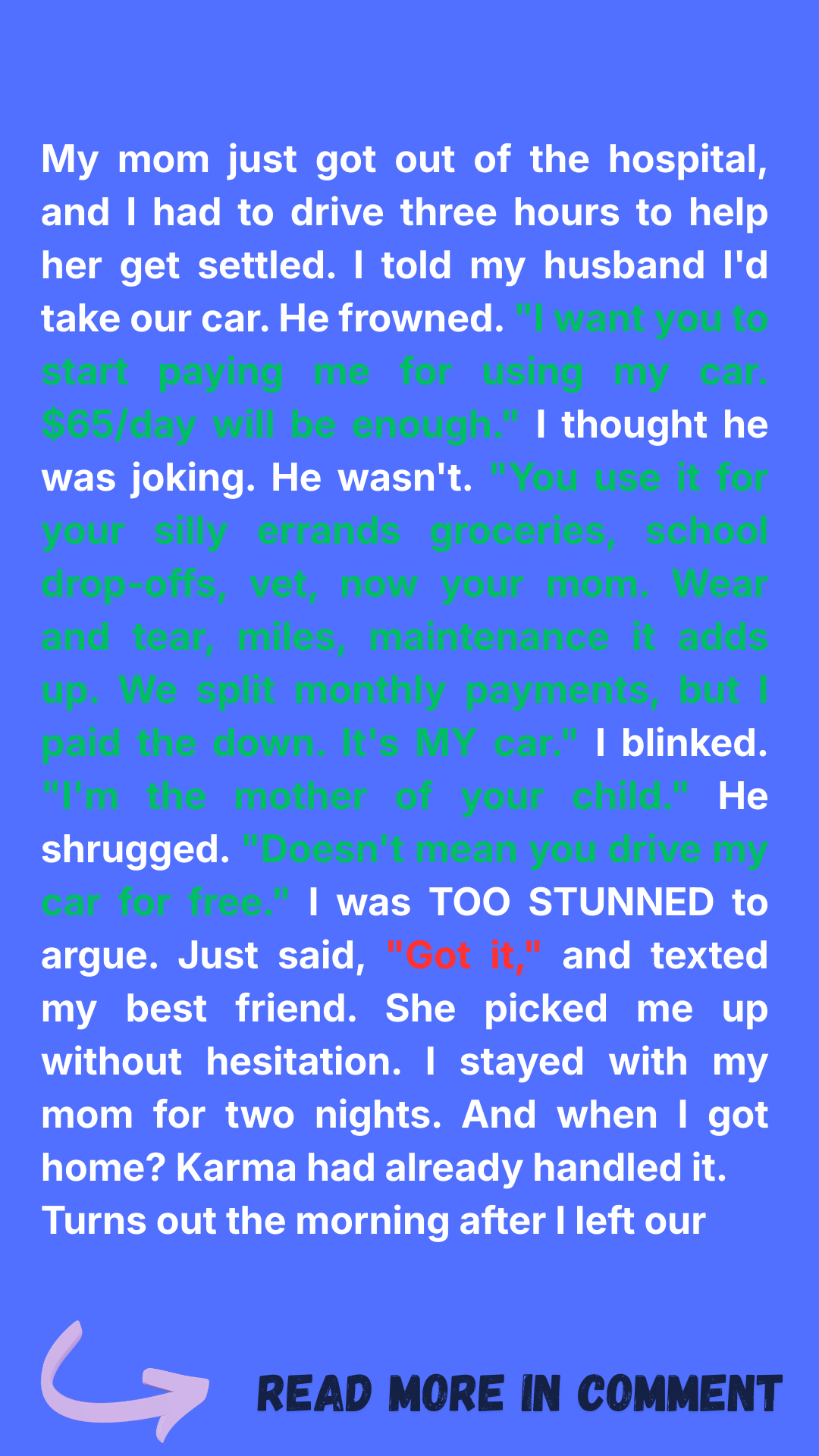 I was heading out to visit my mom after her stroke and asked to borrow my husband’s car. His response shook me: “Sure—$65 a day!” I was shattered when I realized he didn’t see me as his wife… just a roommate with a bill. But while I was gone, karma delivered a lesson he won’t forget.