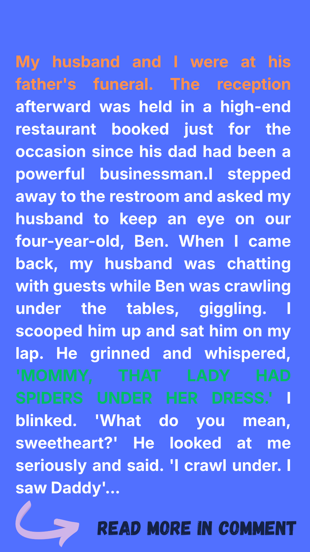 When I returned, Arthur was still deep in conversation. Ben was gone. My heart raced until I heard giggling under the tables. He was crawling beneath them like a fort. I scooped him up, sat him on my lap, and scolded him gently. That’s when he whispered: “Mommy, that lady had spiders under her dress.”