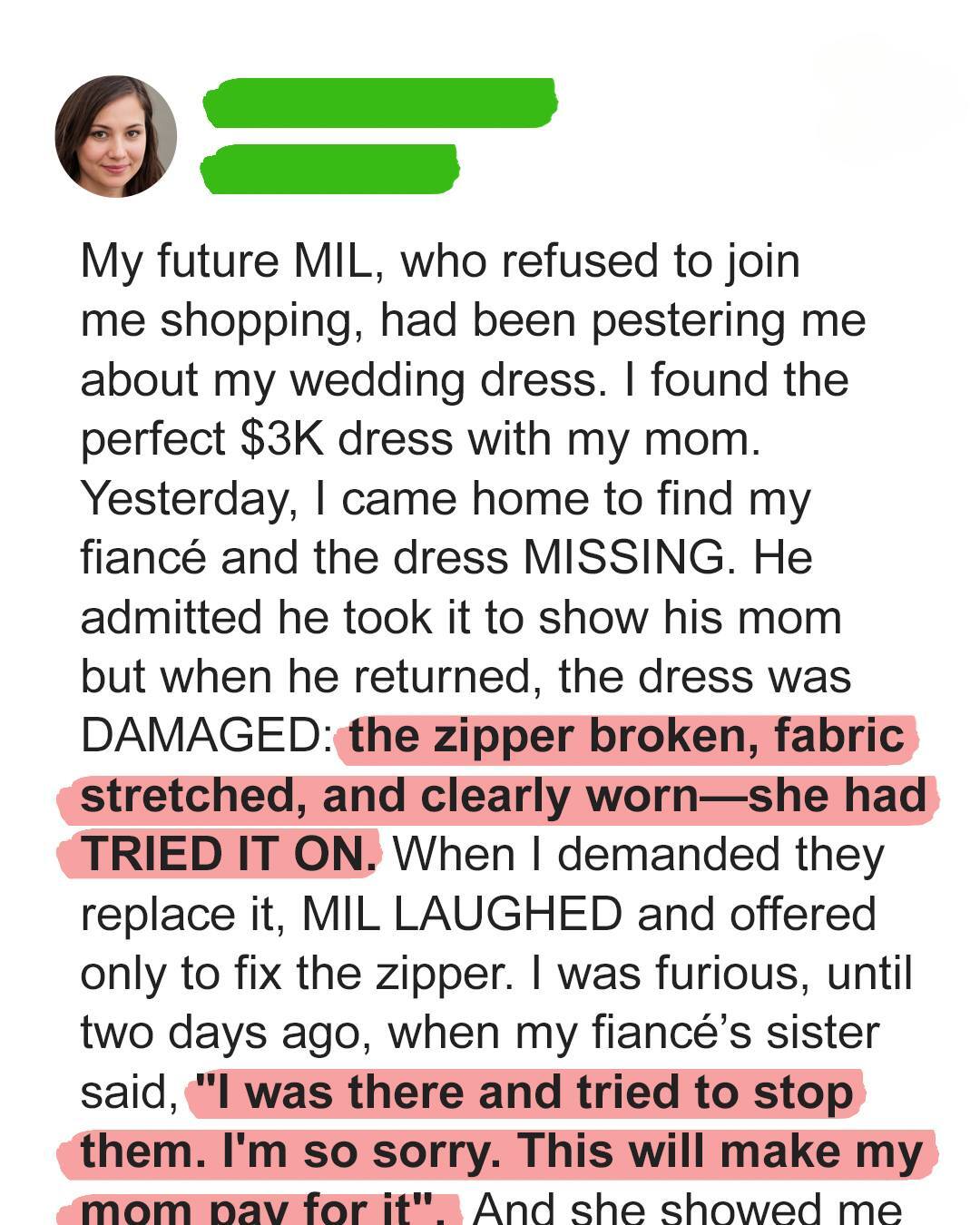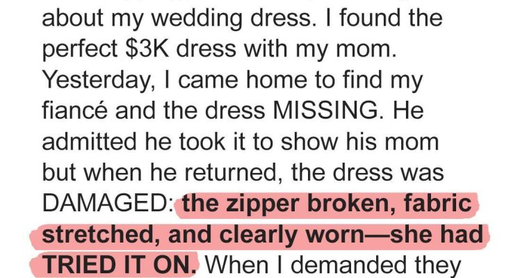 Two weeks later, I came home to find my dress gone. My fiancé, Mark, confessed he’d taken it to show his mom. When he returned it, my heart sank: the dress was stretched, the lace ripped, the zipper broken.