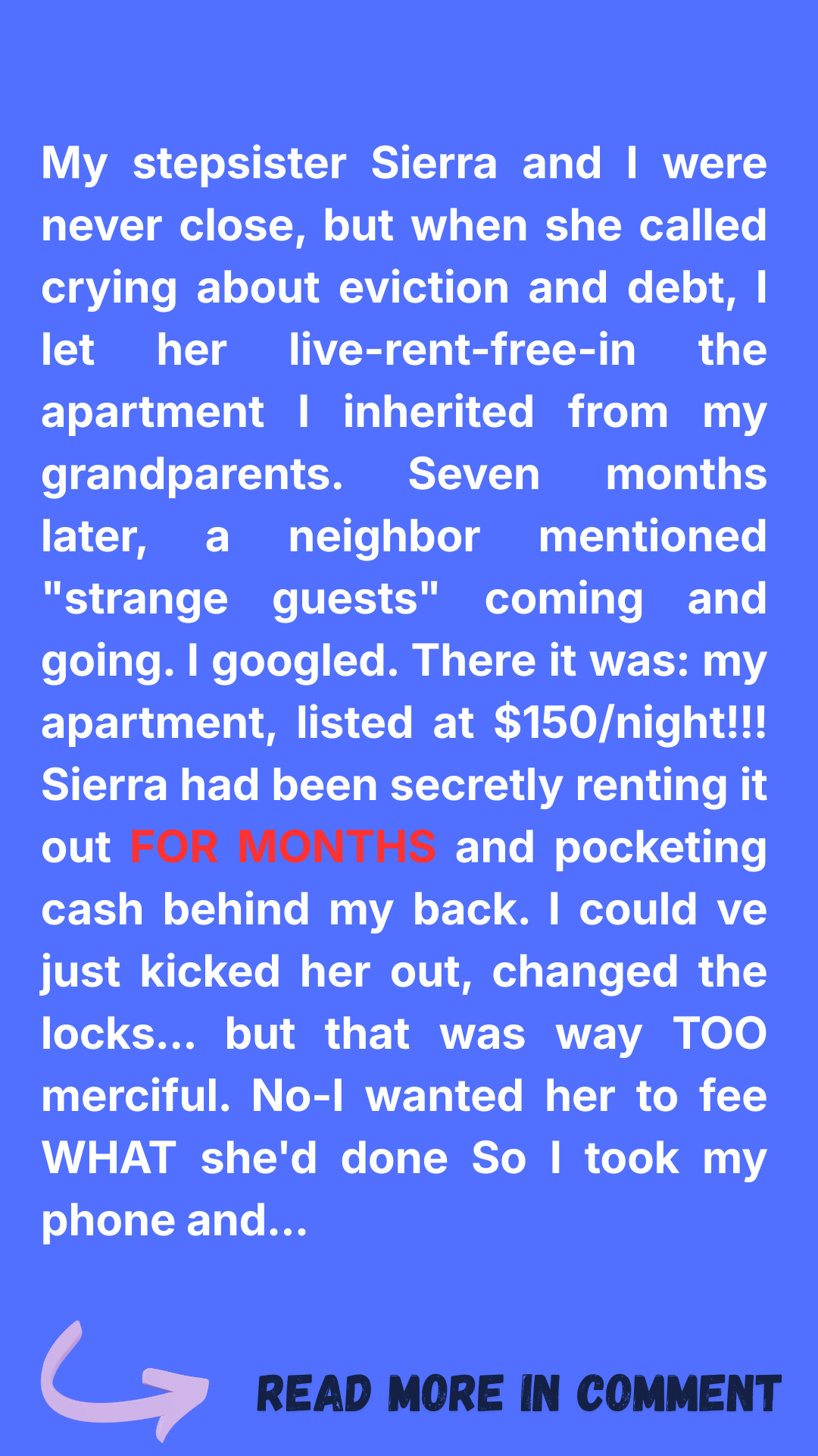 So it was no surprise — or so I thought — when she called one rainy Tuesday, voice cracking, saying she was drowning in debt, behind on rent, and facing eviction. She begged — really begged — saying everyone else told her to “figure it out myself.” Her plea? Could she stay in my spare apartment rent-free for a few months while she got back on her feet?