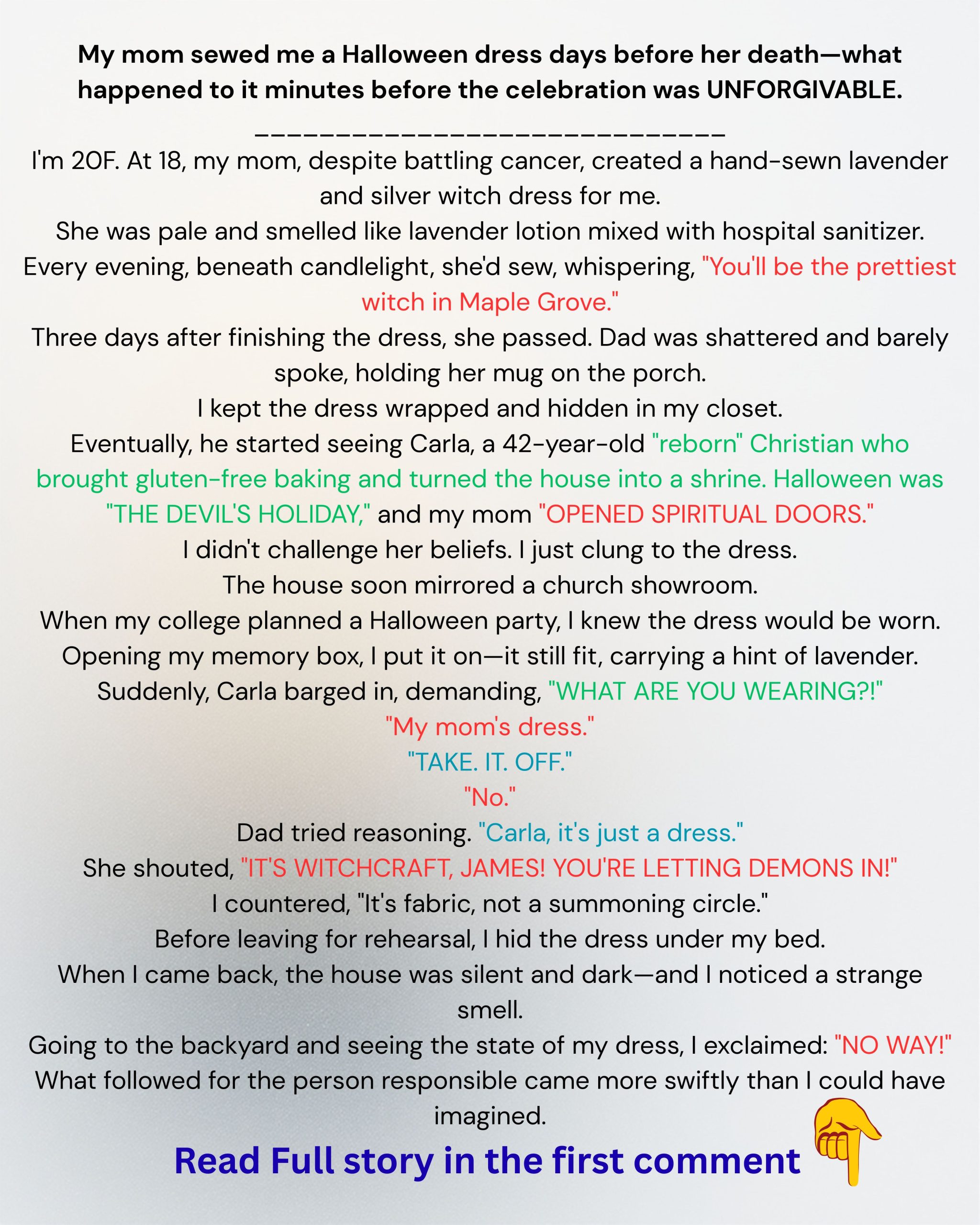 I was eighteen when my mom sewed me a Halloween dress. She sat by the window every evening, pale and thin, the scent of lavender lotion barely covering the hospital-wipes smell that clung to her skin. Yet she smiled at me as if I were the one thing keeping her strong. In her lap lay fabric and trembling fingers, and in those stitches she was threading hope.