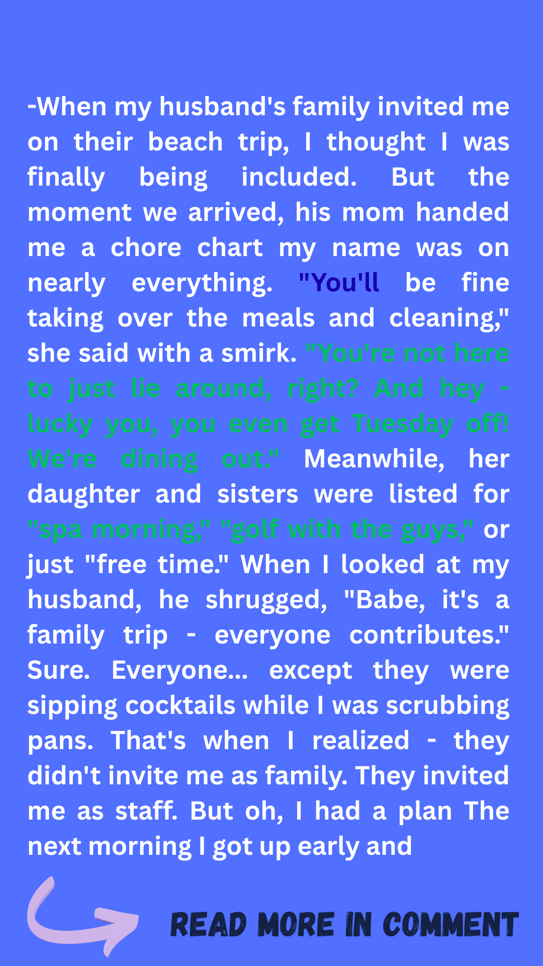That night, I stood on the balcony as the sun set over the water, trying to decide what to do. I could either play along and silently be the household help for the next ten days… or I could show them all exactly what I thought about this “vacation.”