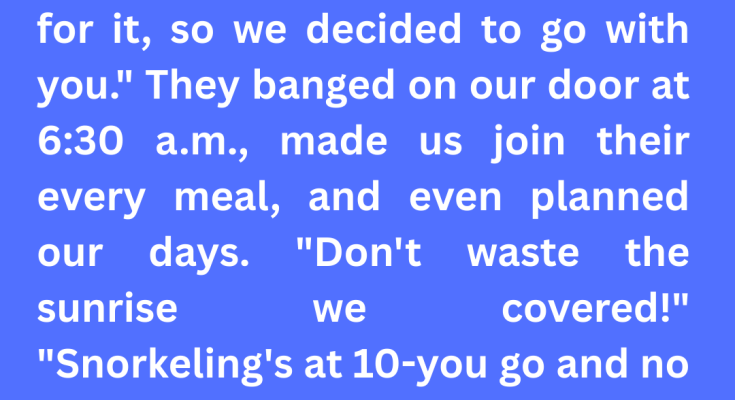 At first, we tried to be gracious. After all, they paid for the trip, so maybe we should act grateful even if we were taken off guard. Sharon was cheerful — introducing us to the breakfast buffet, recommending activities, and generally acting like we’d invited them.
