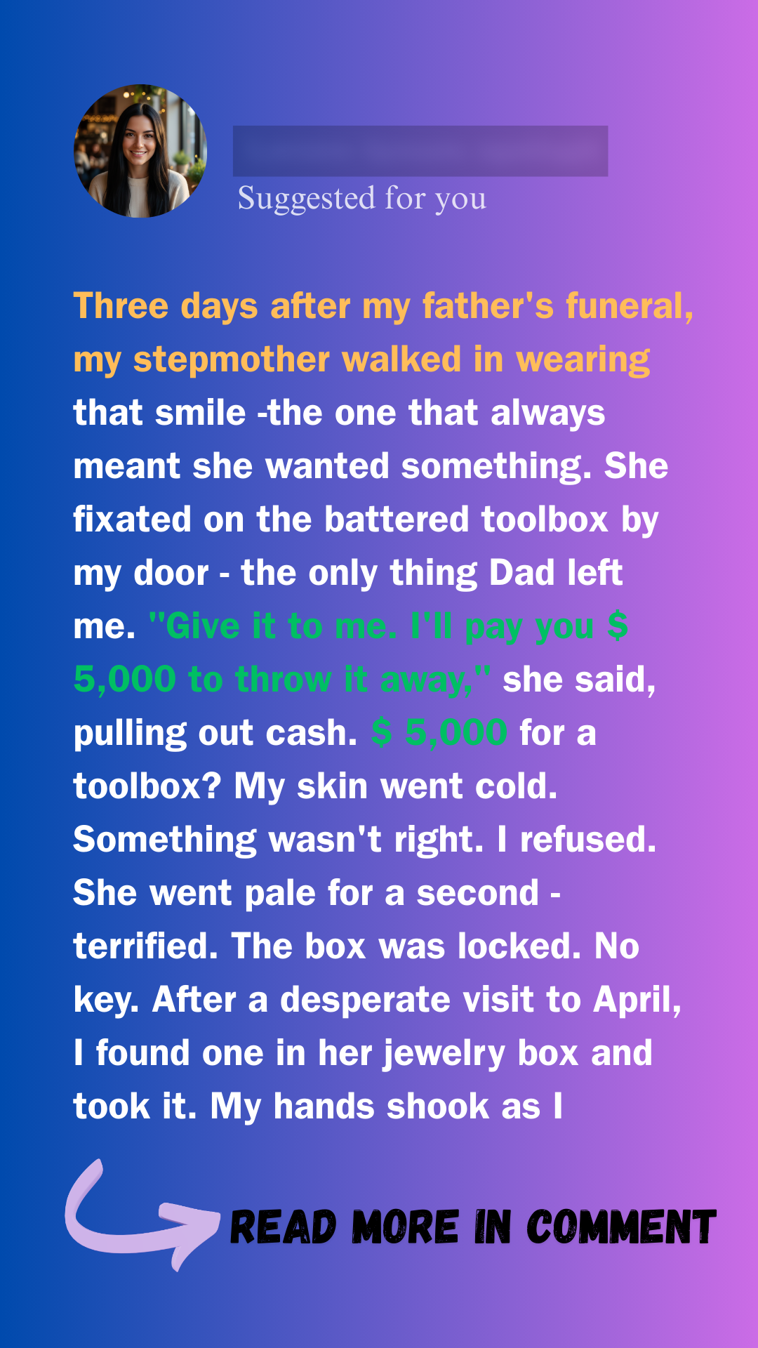 Three days after my father’s funeral, my stepmother walked in with that familiar smile — the one that always meant she wanted something. She immediately stared at the battered toolbox sitting by my door — the only thing Dad left me.