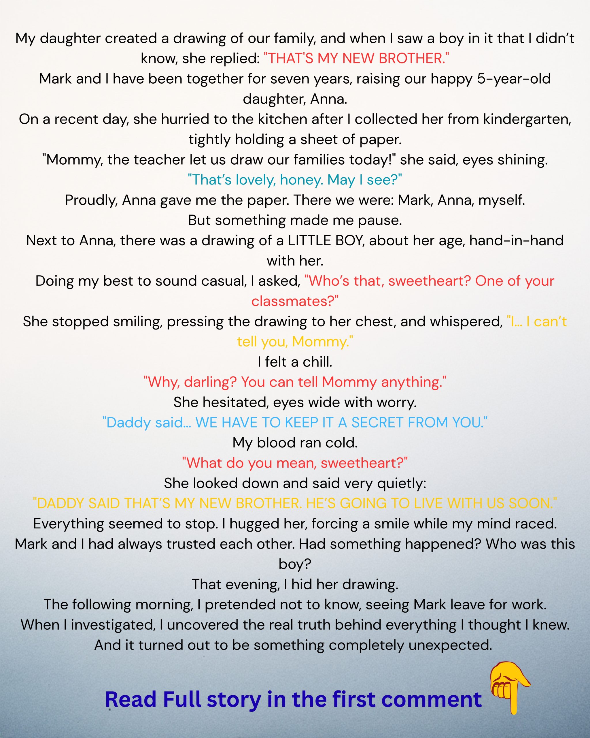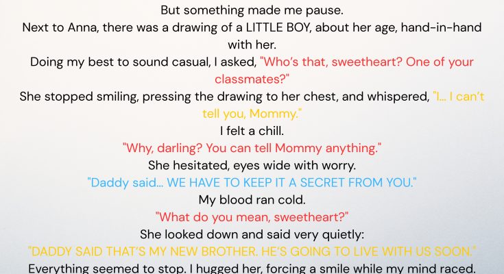 “Who’s this?” I asked, tapping the crayon boy with a fingertip, trying to make it sound casual. The light in Anna’s face vanished. Her voice went small and secretive. “I… I can’t tell you, Mommy. Daddy said you’re not supposed to know.” Then, in a whisper that felt like a stone, she said, “That’s my brother. He’s going to live with us soon.”