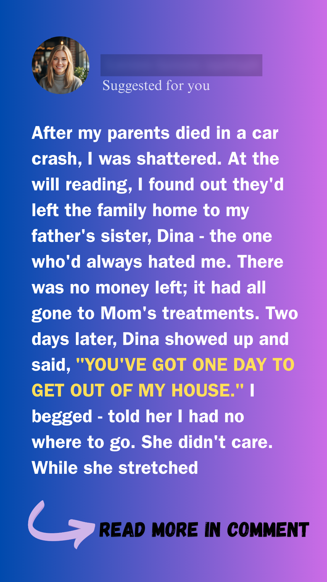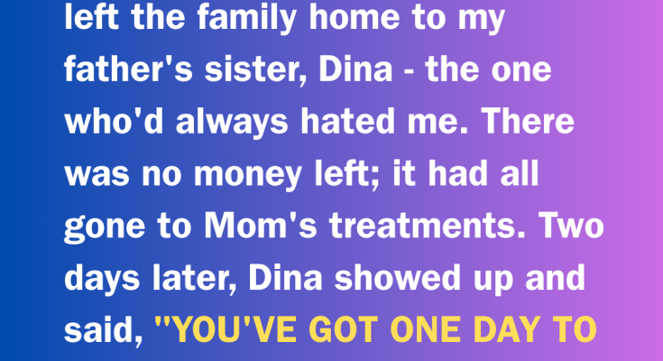 Two days later, Dina showed up. I opened the door in pajamas. She crossed her arms: “You’ve got one day to pack up and get out.”