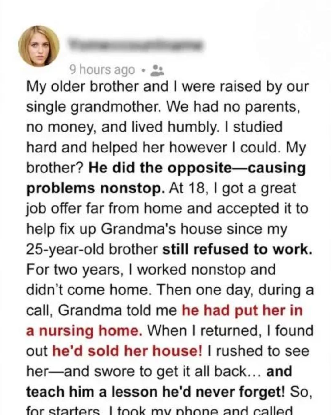 After their parents died, Grandma raised them alone, but Kyle grew bitter and reckless while Aria worked hard to support the household. Despite Grandma’s faith in him, Kyle wasted the money Aria sent home and took advantage of their trust. Confronting Kyle, Aria exposes his lies and deceit, baiting him into breaking into the house he no longer owns.