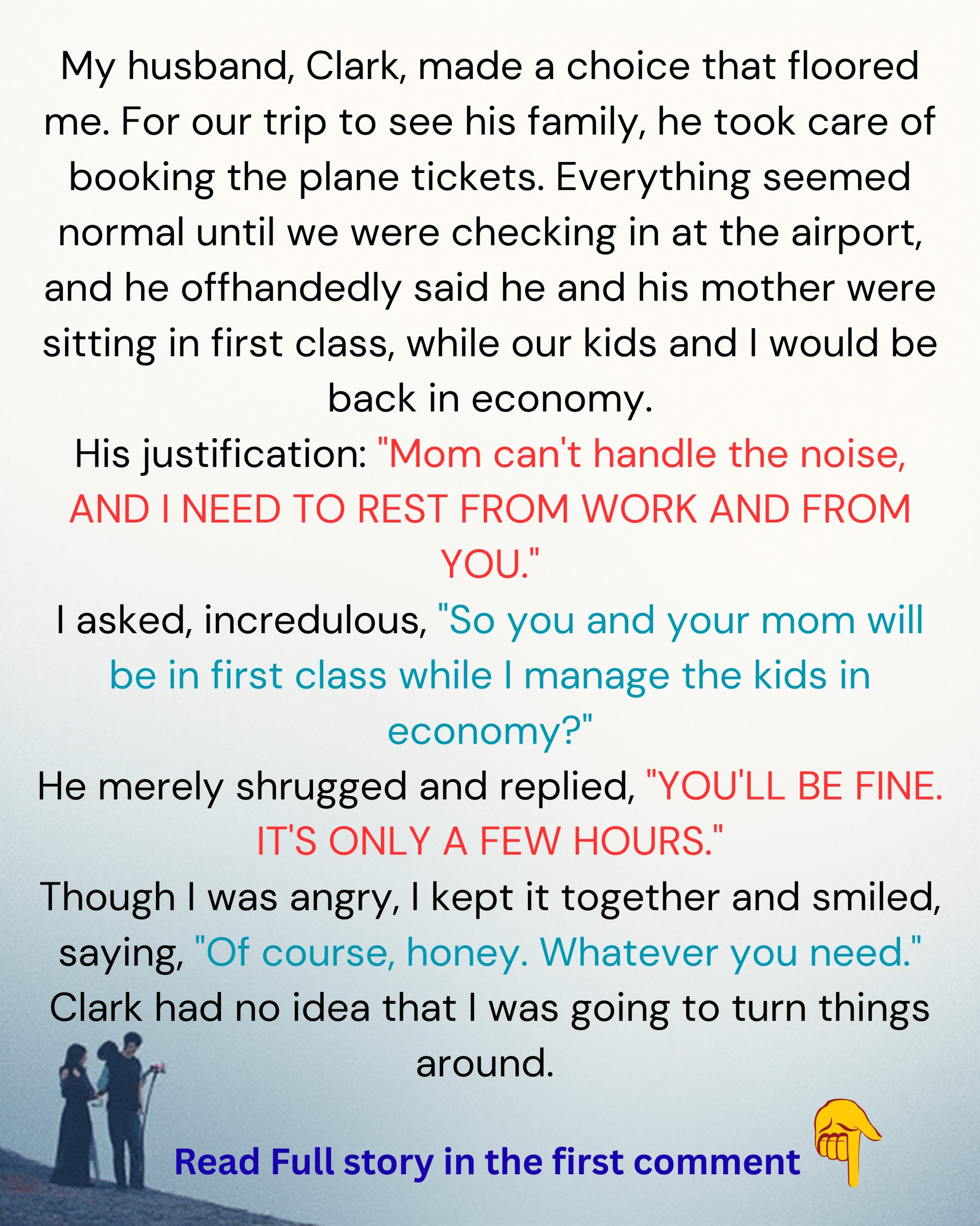 At the airport I asked about our seats and he gave me that sheepish grin I’ve learned to dread. He’d upgraded himself and his mother to first class and left me in economy with the kids. Clark shrugged like it was no big deal. His mother glided by with designer luggage, already picturing champagne and extra legroom. I watched them walk away and felt something shift—anger, yes, but a small, stubborn idea of payback forming in my head.